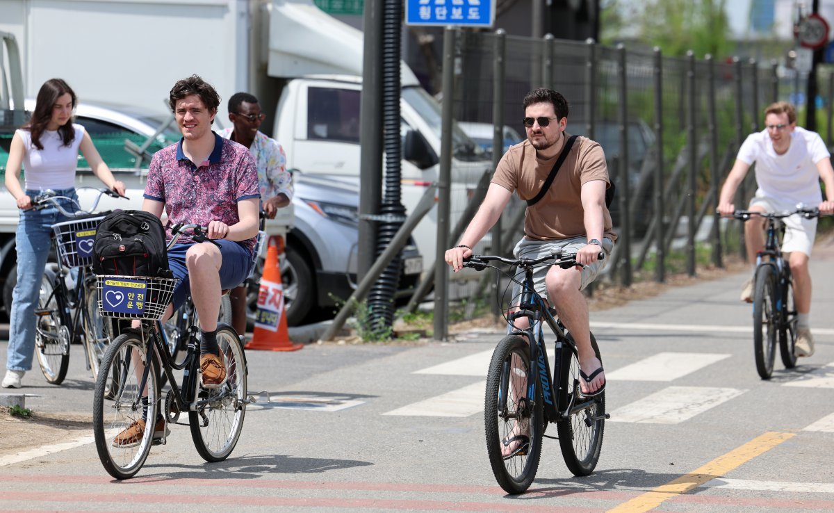 서울의 낮기온이 24도까지 오르며 초여름 날씨를 보인 23일 오후 서울 영등포구 여의도한강공원에서 반팔을 입은 외국인들이 자전거를 타고 있다. 2025.04.23. 서울=뉴시스