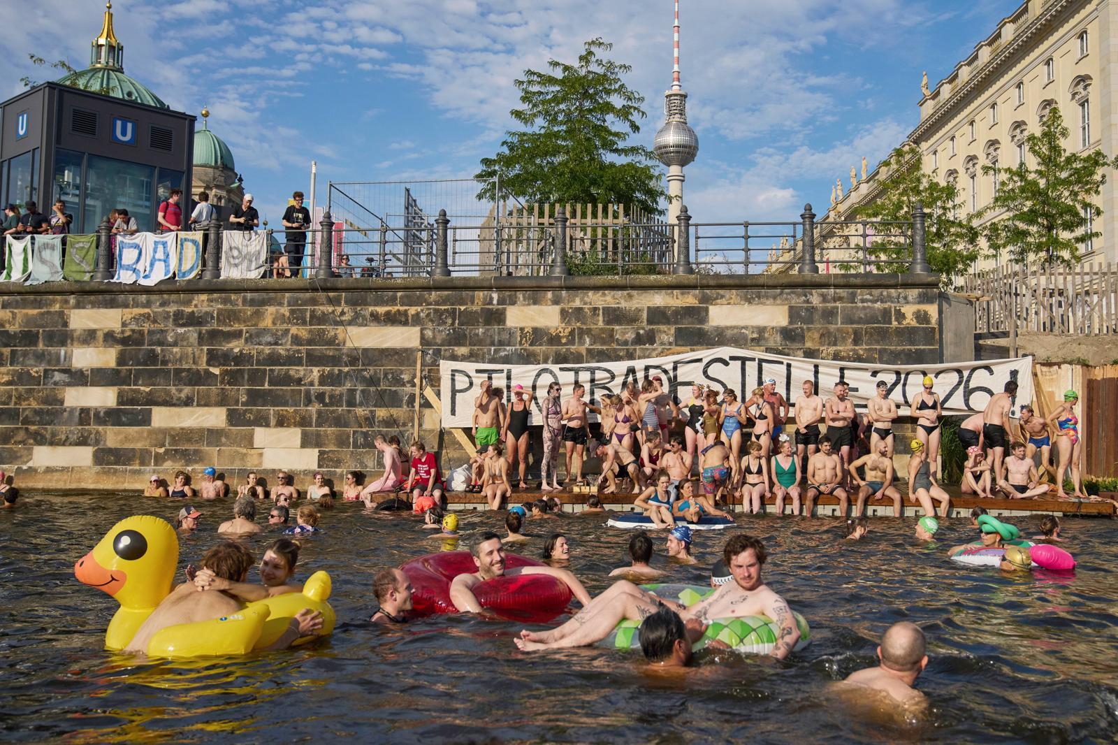 12일 독일 베를린 슈프레강에서 시민들이 수영 금지 해제를 촉구하며 수영하고 있다. 시당국은 수질 오염을 이유로 100년 넘게 슈프레강에서 수영을 금지하고 있다. 시민단체들은 강의 수질이 개선됐다며 수영 허용을 요구해 왔다.