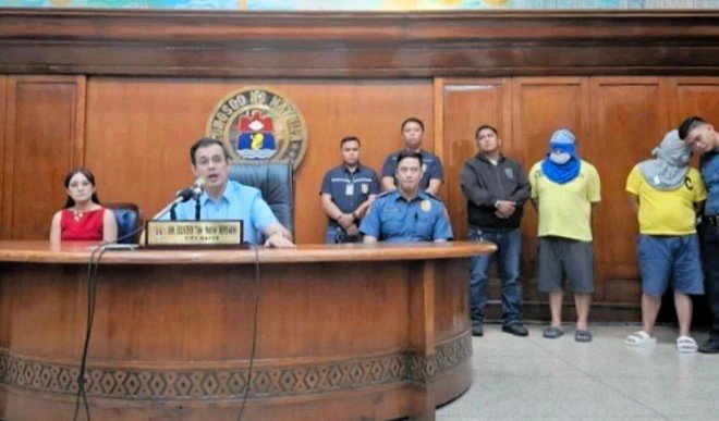 필리핀 수도 마닐라에서 일본인 관광객 남성 2명이 살인 청부를 받은 현지인에게 총을 맞아 사망하는 사건이 발생했다. 마닐라에서 열린 해당 사건 기자회견 모습. 아사히신문 캡처