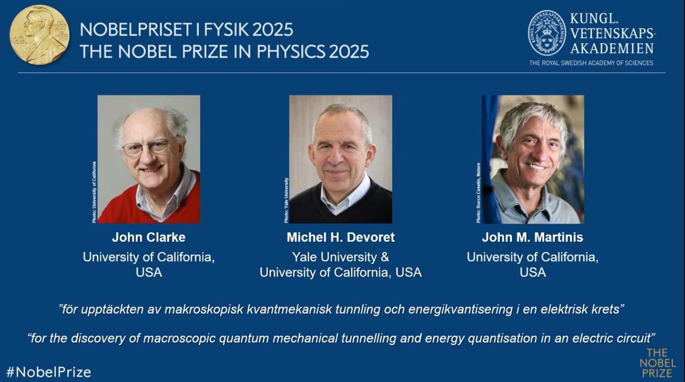 올해 노벨 물리학상은 존 클라크 미국 버클리 캘리포니아대 교수, 미셸 데보레 미국 예일대 및 캘리포니아대 교수, 존 마르티니스 미국 캘리포니아대 교수 등 3인에게 돌아갔다.