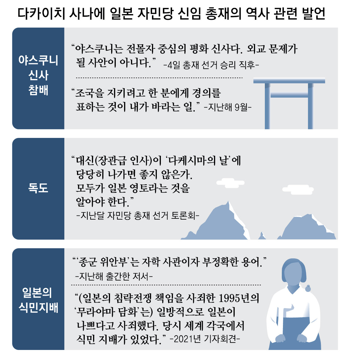 ‘다카이치 역사관’이 한일, 한미일 관계의 리스크로 부각되면서 한국이 외교의 일관성을 일본에 요구해야 한다는 목소리도 나온다.