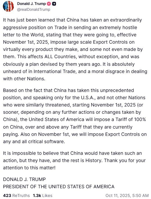 그는 “중국이 무역 문제에 대해 극도로 공격적인 입장을 취하며 전 세계에 극히 적대적인 서한을 보냈다는 사실이 방금 확인됐다”면서 “해당 서한에는 2025년 11월 1일부터 자국이 생산하는 거의 모든 제품과 심지어 자국에서 생산하지도 않는 일부 제품에 대해 대규모 수출 통제를 시행할 것이라고 명시되어 있었다”라고 주장했다.
