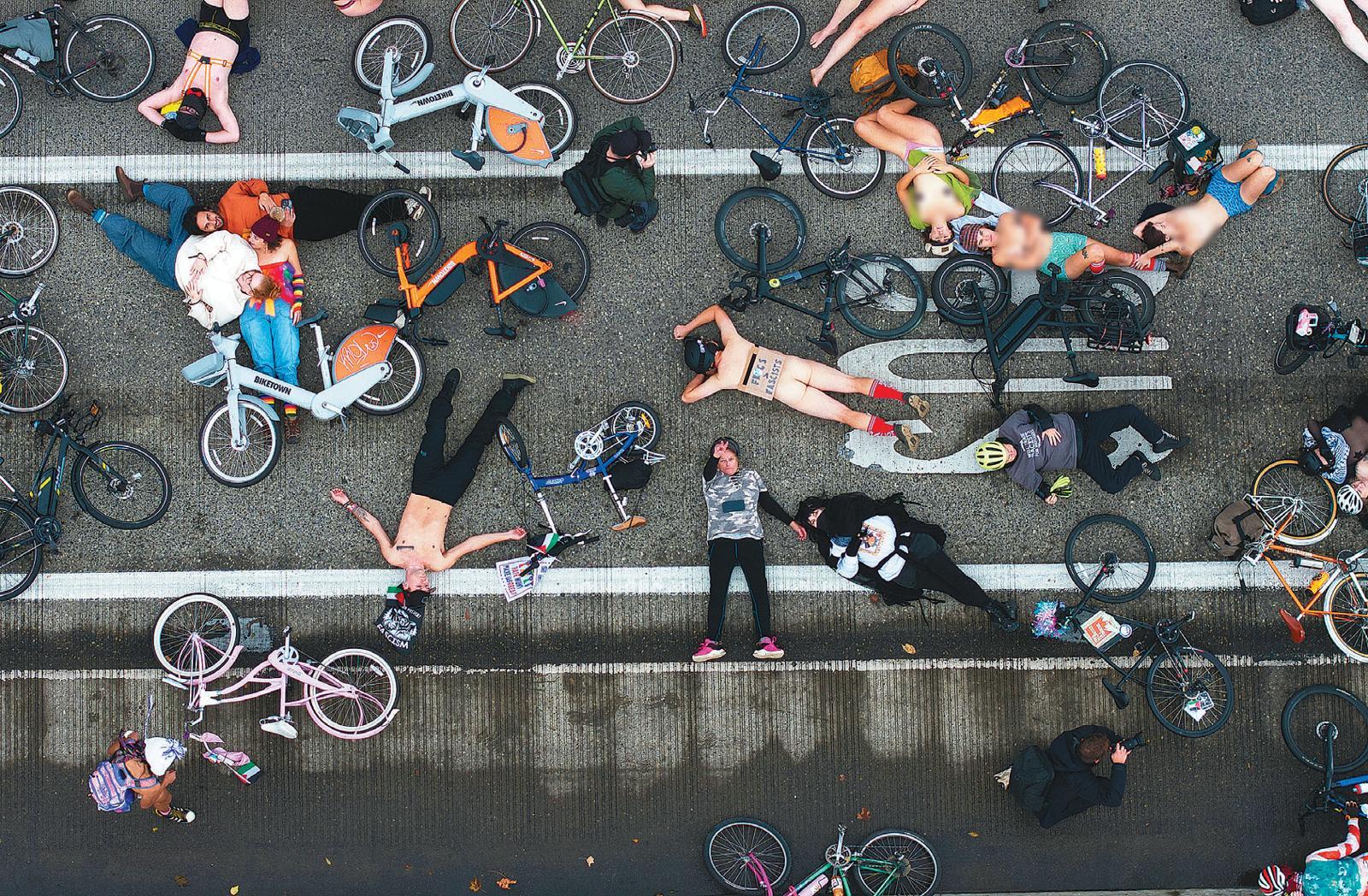 12일 미국 오리건주 포틀랜드의 번사이드 다리에서 자전거 이용자들이 도널드 트럼프 대통령에게 항의하기 위해 벌거벗고 누워 시위를 벌이고 있다. 트럼프 대통령은 민주당 지지세가 강한 이곳에 치안 유지를 이유로 군대를 투입하려 했으나 법원에 제지당했다.