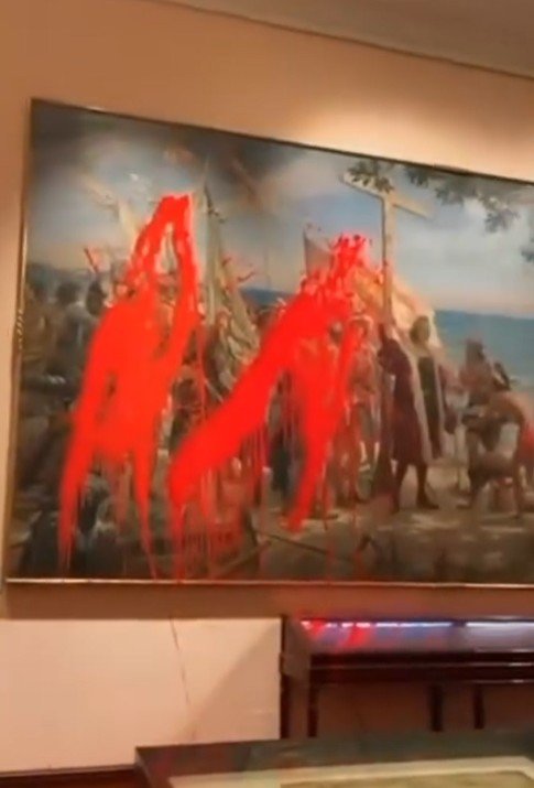 13일(현지 시간) 스페인 일간 엘파이스 등에 따르면 전날 마드리드 해군 박물관에서 스페인 환경단체 ‘미래 식물’(Futuro Vegetal) 소속 활동가 2명이 회화 작품 ‘콜럼버스에게 바치는 첫 경의’에 붉은색 페인트를 투척했다. 이후 이들은 ‘10월 12일, 축하할 것 없다. 생태사회적 정의(Ecosocial justice)’라고 적힌 현수막을 펼쳐 들었다.
