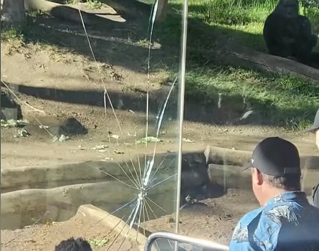 세 겹으로 된 강화 유리였지만, 육중한 무게가 실린 고릴라의 가격에 버티지 못했다. 강화 유리는 여러 갈래로 금이 갔다. 깜짝 놀란 관람객들이 비명을 지르며 도망쳤다.