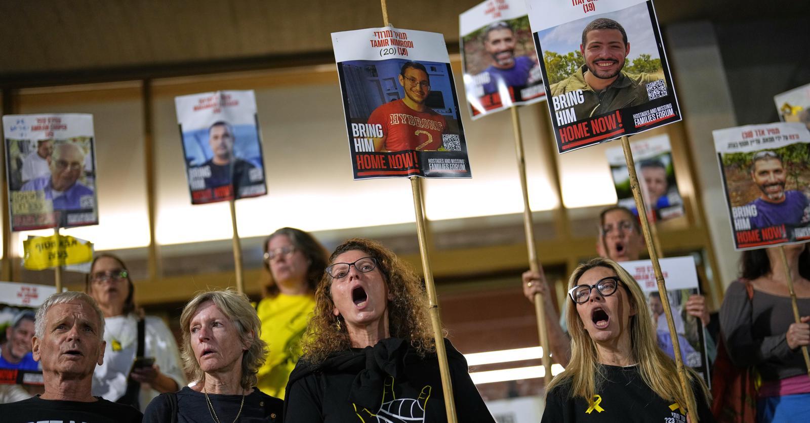 14일 이스라엘 텔아비브의 ‘인질 광장’에서 2023년 10월 팔레스타인 무장단체 하마스에 납치된 후 사망했지만 아직 시신을 돌려받지 못한 인질들의 가족이 유해 송환을 요구하는 시위를 벌이고 있다. 하마스는 13일 생존 인질 20명을 전원 석방했지만 시신 28구 중 4구만 돌려보냈다. 텔아비브=AP 뉴시스