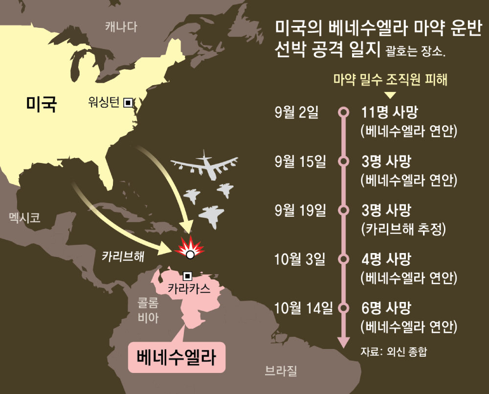 미국은 지난달 2일부터 최소 다섯 차례에 걸쳐 공해상에서 베네수엘라 마약 밀매 조직 선박을 공격했다. 가장 최근 공격은 14일에 진행됐다. 이와 관련해 트럼프 대통령은 트루스소셜을 통해 베네수엘라 해안 앞에서 배에 타고 있던 6명의 남성을 살해했다고 설명하며 “이 선박이 마약을 밀매하고 있으며 밀수 경로로 알려진 경로를 따라 이동하고 있음을 확인했다”고 주장했다. 최소 27명의 베네수엘라인이 지난달 2일 이후 미군의 공격으로 숨진 것으로 전해졌다.