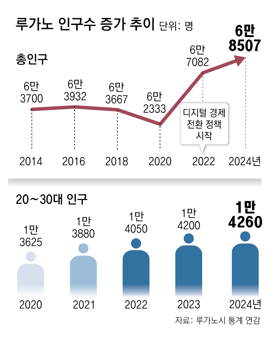 스위스 남부의 이탈리아어권 도시인 루가노 인구는 지난해 기준 6만8507명. 강원 삼척시(6만9000명)나 경북 문경시(7만1000명) 수준의 소도시로 2010년대 들어 인구 감소에 시달렸다. 루가노 인구는 2020년 6만2333명으로 떨어졌지만, 이후 디지털 경제 도시를 표방한 뒤 4년새 10% 가까이 늘었다. 불과 4년 만에 6000명 이상이 늘었고 3년간 유치한 가상자산 관련 스타트업만 100여 개에 이른다. 청년층이 최신 기술을 활용한 사업을 하기 위해 찾는 도시로 탈바꿈하고 있는 것이다.