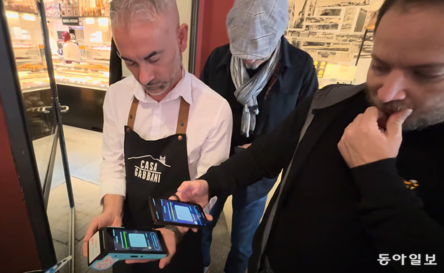 지난달 18일 스위스 루가노 시내 이탈리아 음식점에서 자코모 주코 씨가 에스프레소 값을 비트코인으로 결제하고 있다. 루가노=임현석 기자 lhs@donga.com지난달 18일(현지 시간) 오전, 스위스 남부 소도시 루가노 도심에 1937년 개업한 이탈리아 음식점. 2.3스위스프랑(약 4100원)짜리 에스프레소 한 잔을 주문하자 중년 종업원이 QR코드 단말기를 내밀었다. 스마트폰을 켜고 비트코인과 연동된 가상지갑 애플리케이션(앱)으로 코드를 찍자 즉시 결제가 이뤄졌다.