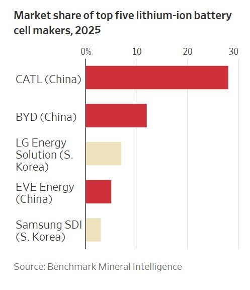 미 월스트리트저널(WSJ)은 5일 중국은 리튬 이온 배터리, 성숙 공정 반도체, 그리고 일부 제약 원료에서 절대적인 비중을 차지하고 있다고 보도했다.