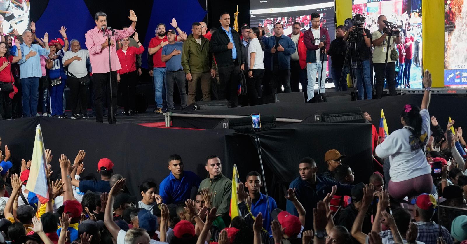 마두로 “美에 맞서겠다” 니콜라스 마두로 베네수엘라 대통령(연단 위 분홍색 상의 입은 사람)이 15일 수도 카라카스에서 민간인 무장 부대에 합류한 시민들과 함께 미국에 맞서겠다고 강조했다. 도널드 트럼프 미국 대통령은 마약 소탕 등을 이유로 연일 베네수엘라에 대한 군사 위협을 가하고 있다. 카라카스=AP 뉴시스