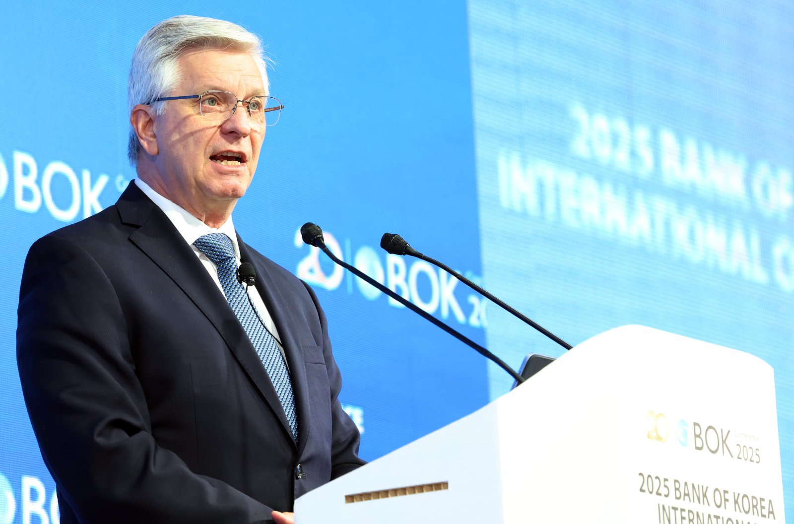 크리스토퍼 월러 미국 연방준비제도 이사가 2일 오전 서울 중구 한국은행 신축별관 컨퍼런스홀에서 열린 ‘BOK 국제컨퍼런스’에서 기조연설을 하고 있다. 2025.6.2/뉴스1