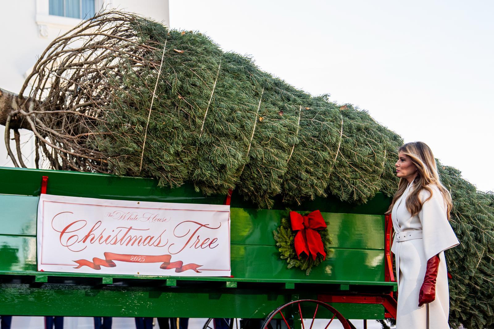 도널드 트럼프 미국 대통령의 부인 멜라니아 여사가 24일 워싱턴 백악관 북쪽 현관에 도착한 2025년 공식 백악관 크리스마스트리를 살펴보고 있다. 백악관은 매년 크리스마스 시즌에 영부인이 직접 장식한 트리를 공개해 왔다.