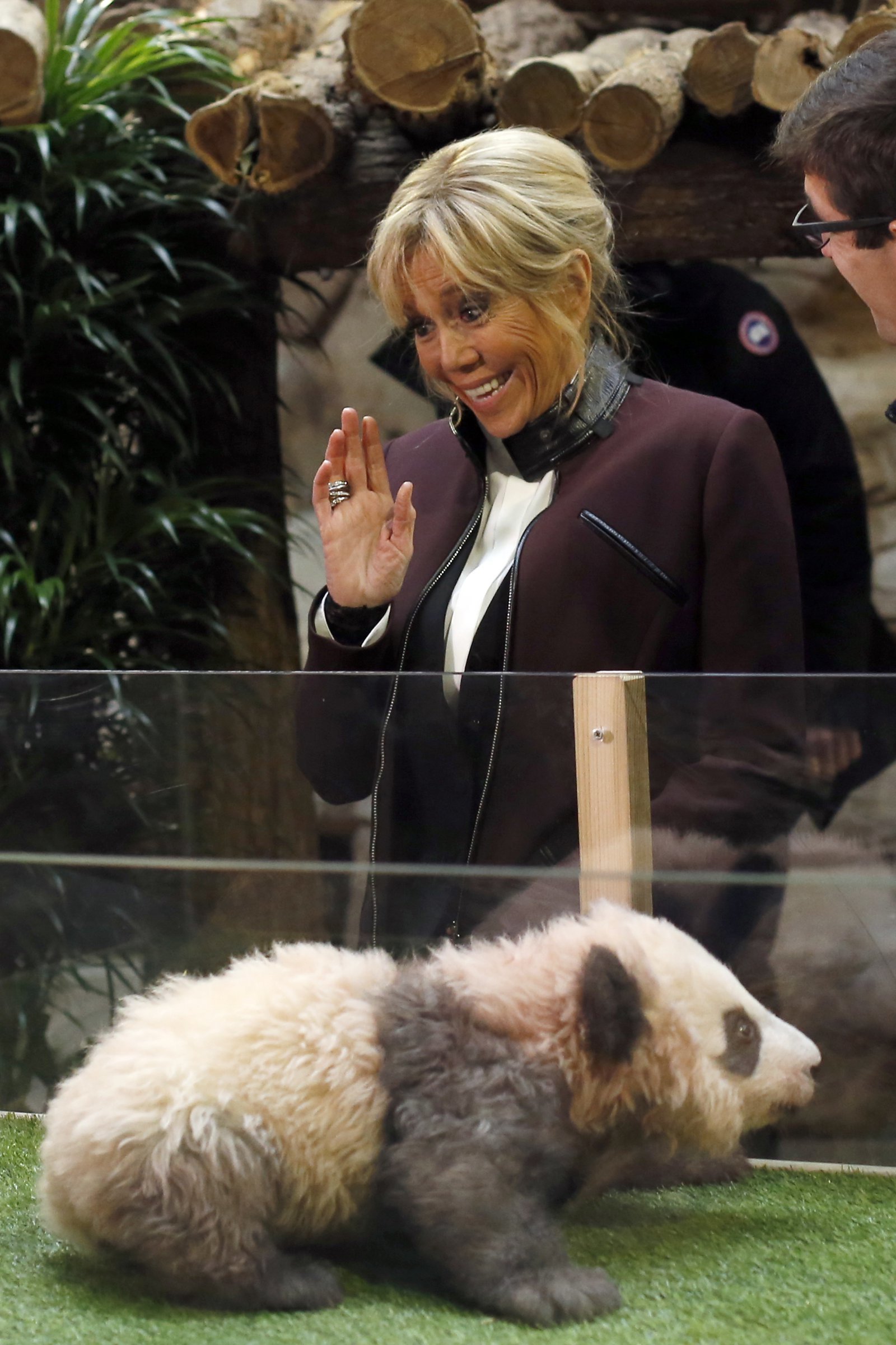 에마뉘엘 마크롱 프랑스 대통령이 중국을 국빈 방문 중인 가운데, 중국이 오는 2027년 프랑스에 암수컷 판다 한 쌍을 추가로 보낼 예정이라고 밝혔다. 사진은 에마뉘엘 마크롱 프랑스 대통령의 부인 브리지트 여사가 2017년 보발 동물원에서 생후 4개월 된 아기 판다를 향해 손을 흔드는 모습. 2025.12.05 생테냥쉬르셰르=AP 뉴시스