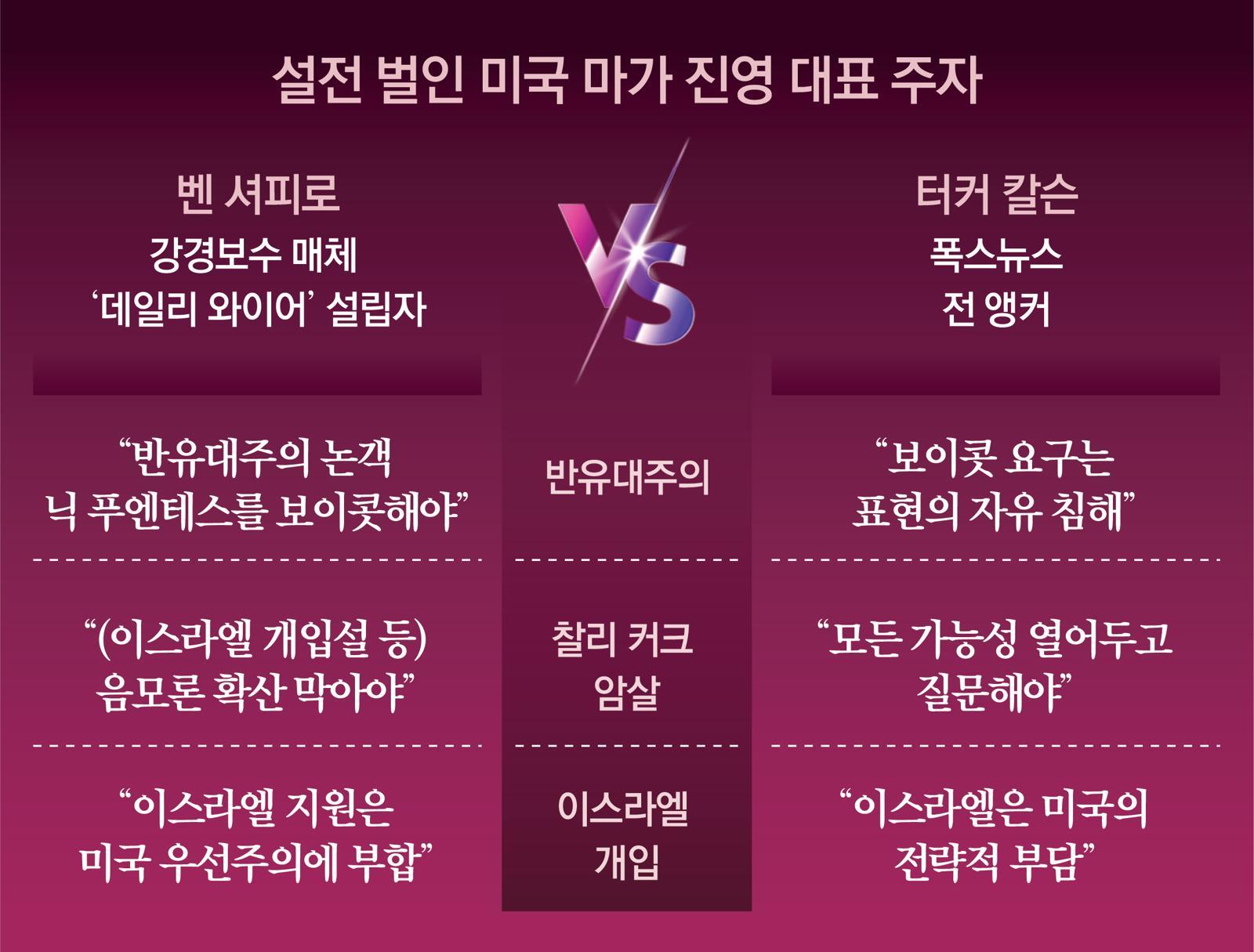 도널드 트럼프 미국 대통령의 강성 지지층 ‘마가’(MAGA·미국을 다시 위대하게)를 대표하는 논객으로 꼽히는 보수 매체 ‘데일리 와이어’의 설립자 벤 셔피로(41)와 터커 칼슨 전 폭스뉴스 앵커(56)가 주요 마가 인사의 반(反)유대주의 논란, 올 9월 숨진 우파 논객 찰리 커크의 암살 배후, 트럼프 2기 행정부의 외교안보 정책 등을 놓고 충돌했다.