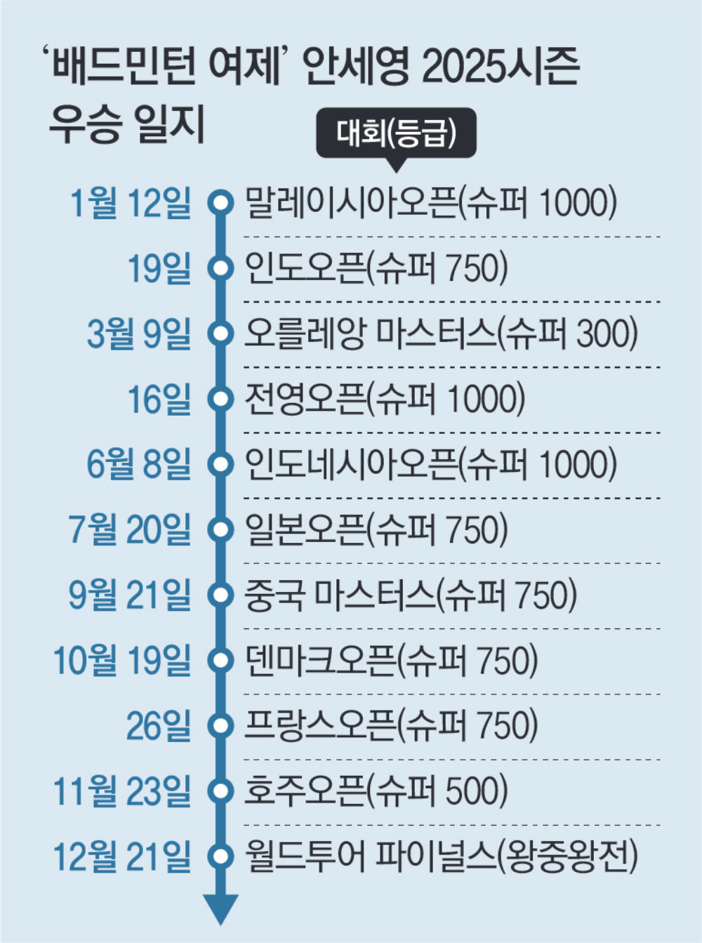 ‘배드민턴 여제’ 안세영(23)이 역대 남녀 배드민턴 한 시즌 최다승 타이기록(11승)을 달성했다. 또 역대 단식 최고 승률(94.8%)과 최고 상금(100만3175달러·약 14억8570만 원)까지 새 역사를 썼다.