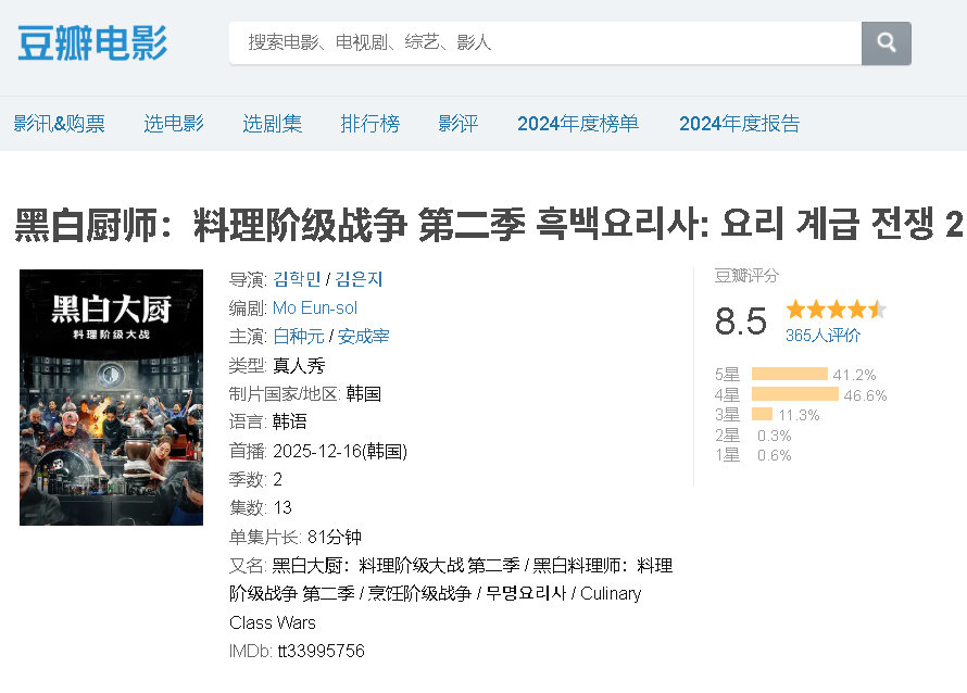 최근 중국 최대 리뷰 사이트 더우반에는 넷플릭스 ‘흑백요리사: 요리 계급 전쟁2’ 페이지가 만들어졌다. 23일 오전 기준 리뷰 70여 건이 올라왔고, 별점 평가에 370여 명이 참여했다. 중국에선 넷플릭스가 서비스되지 않기에 흑백요리사2를 불법시청 한 후 리뷰를 남긴 것으로 보였다.