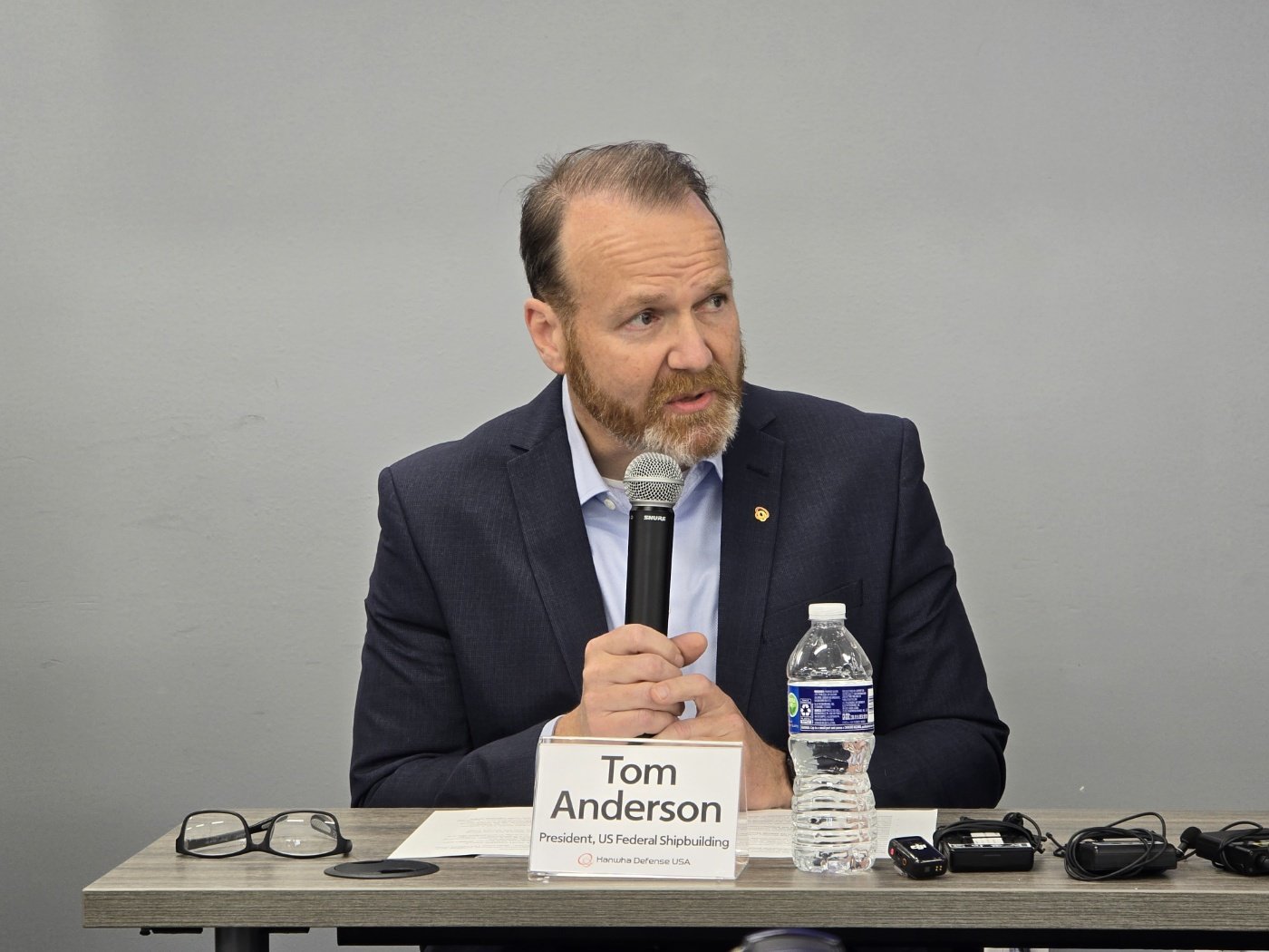 지난 22일(현지시간) 미국 펜실베이니아주 필라델피아에 위치한 한화필리조선소에서 열린 미디어데이 행사에서 톰 앤더슨 한화디펜스USA 조선사업부문 사장이 한화의 핵추진잠수함 건조 추진 계획에 대해 밝히고 있다. 2025.12.25. ⓒ News1