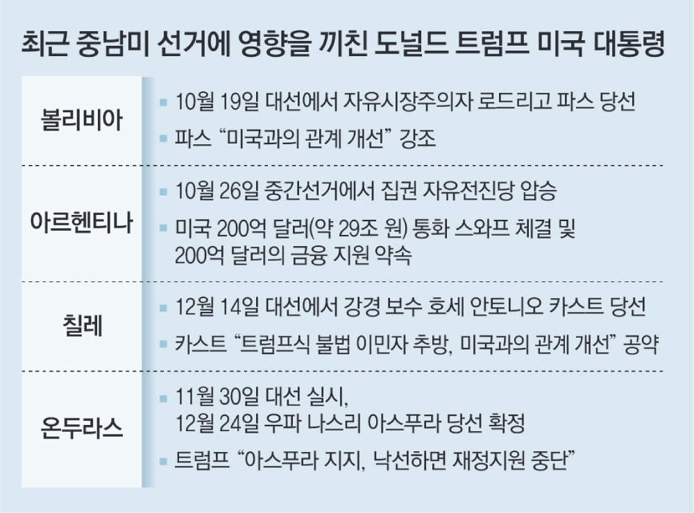 트럼프 대통령은 재집권 후 중남미 전역의 우파 정치인을 전폭적으로 지원하며 친미 국가를 늘리려 하고 있다. 올 10월 아르헨티나 중간선거 당시 ‘아르헨티나 트럼프’로 불리는 하비에르 밀레이 대통령이 속한 강경우파 성격의 집권 자유전진당이 좌파 연합에 패할 것이란 전망이 우세했다. 그는 200억 달러(약 29조 원) 통화 스와프 체결, 200억 달러의 별도 금융 지원 등을 약속하며 밀레이 대통령을 도왔다.