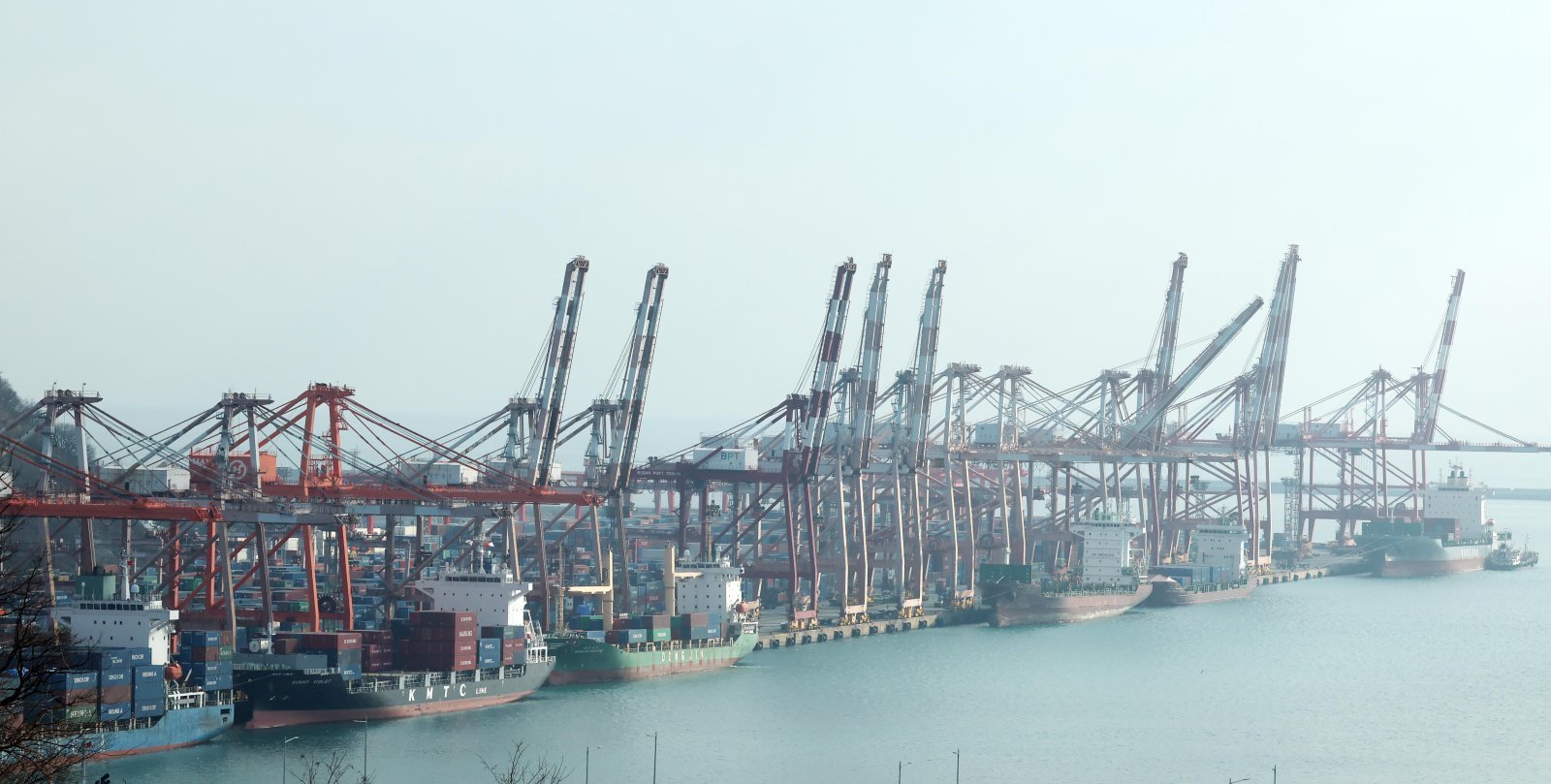 산업통상부와 관세청은 29일 오후 1시3분 기준으로 잠정 집계한 결과, 연간 누계 수출액이 7000억 달러를 달성했다고 밝혔다. 이는 전 세계에서 6번째 달성한 기록이다. 이날 오후 부산 남구 신선대 부두에 컨테이너 선박이 줄지어 정박하고 있다. 2025.12.29. [부산=뉴시스]