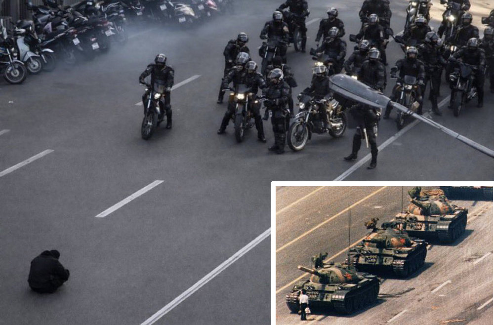 36년 전 中 ‘탱크맨’처럼… 이란 남성, 오토바이 경찰과 대치 지난해 12월 28일부터 이란에서 화폐 가치 급락, 고물가 등에 반발하는 대규모 반정부 시위가 이어지는 가운데 한 남성이 수도 테헤란 도로에 앉아 오토바이를 탄 경찰들과 대치하고 있다(위 사진). 이 장면을 담은 영상이 확산되면서 이 남성을 1989년 6월 중국의 민주화운동 ‘톈안먼 시위’ 당시 맨몸으로 당국의 유혈 진압에 맞선 이른바 ‘탱크맨’과 비교하는 목소리도 나온다. 사진 출처 ‘X’·동아일보DB