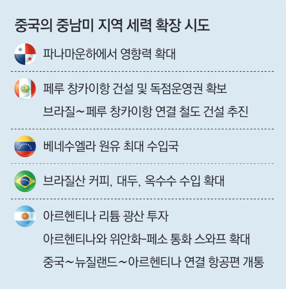 중국은 지난해 12월 10일 ‘중남미·카리브(LAC) 정책 문건’에서 “중남미를 포함한 글로벌사우스(남반구 개발도상국·신흥국) 국가와의 공동 운명을 공유해 왔다”며 유대감을 강조했다. 지난해 12월 4일 미국이 발표한 새 국가안보전략(NSS)에서 중남미에 대한 군사력 증강 필요성을 강조한 것에 대한 ‘맞불’ 차원으로 풀이된다. CSIS는 “중국이 중남미에서 외교·경제 연대를 강화하고 자신들을 미국에 대한 대안으로 자리매김하려 한다”고 분석했다.