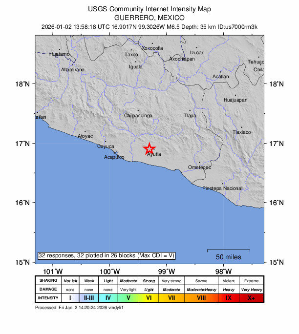 이날 미국 지질조사국(USGS)에 따르면 이날 오후 10시 58분쯤 멕시코 게레로주 란초 비에호 북북서쪽 4㎞ 지점에서 규모 6.5의 강진이 발생했다.