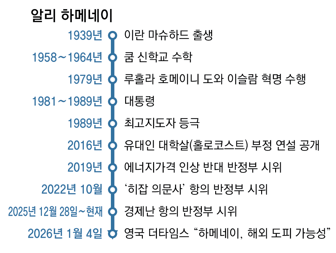 지난해 12월 28일부터 극심한 경제난에 항의하는 대규모 반정부 시위가 벌어지고 있는 신정일치 국가 이란의 최고지도자 알리 하메네이(87)가 시위 진압 실패에 대비해 러시아 등으로의 망명을 준비하고 있다고 영국 더타임스가 4일 보도했다. 지난해 6월 이스라엘과의 ‘12일 전쟁’에서 사실상 패배한 뒤 고령의 하메네이가 정신적, 신체적으로 취약해졌고 생존에 대한 두려움 또한 커져 1989년 집권 후 최대 위기를 맞았다는 분석이 나온다.