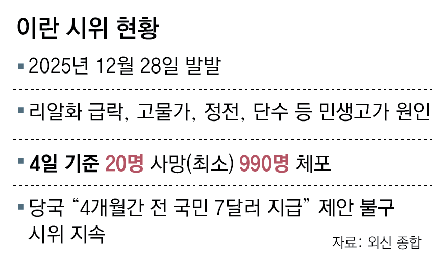이란 정부는 5일 시위 진정을 위해 약 8600만 명의 국민에게 “향후 4개월간 매달 7달러(약 1만80원)의 생활비를 지급하겠다”는 유화책을 내놨다. 다만 고질적인 경제난에 지친 국민들의 불만은 수그러들지 않고 있다.