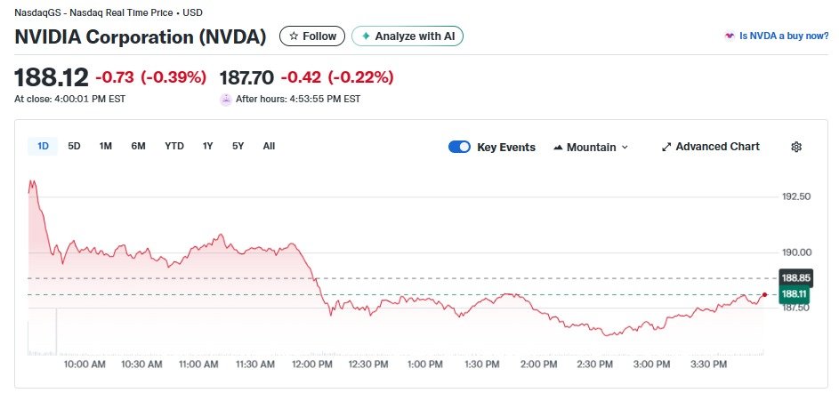 5일(현지 시각) 뉴욕증시에서 엔비디아는 0.39% 하락한 188.12달러로 장을 마감했다. 장 마감 후 시간외거래에서도 0.22% 하락하고 있다.