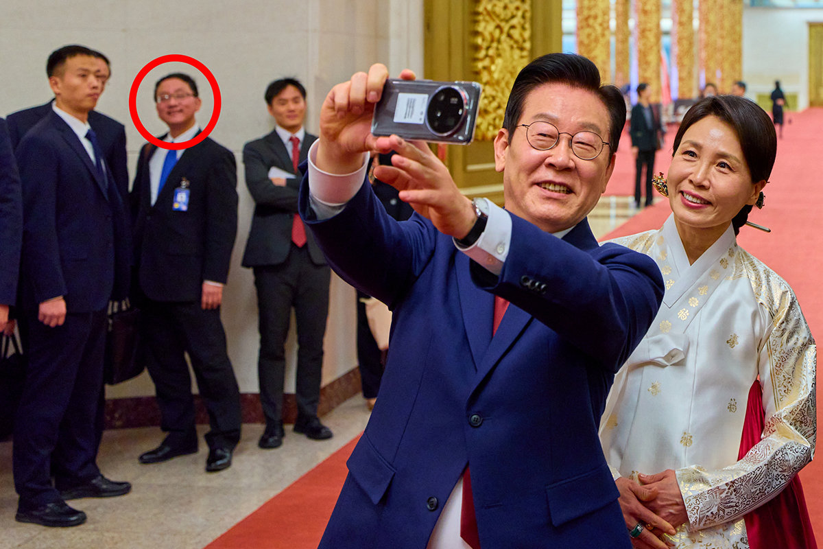 이 대통령은 김혜경 여사와 함께 5일 중국 베이징 인민대회당에서 시진핑 중국 국가주석 부부와 국빈 만찬을 마친 뒤 일전에 시 주석이 경주 아시아태평양경제협력체(APEC) 계기로 방한한 당시 선물해 준 ‘샤오미 15 울트라’ 스마트폰을 사용해 셀카를 찍었다. 양국 당국자들도 이 모습을 가까운 거리에서 지켜봤는데, 이 대통령이 손에 스마트폰을 들고 촬영하는 장면 뒤로 류 국장이 보인다.