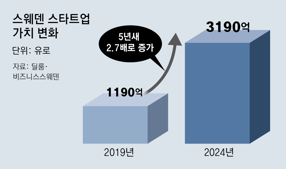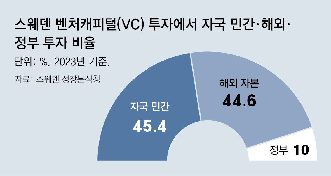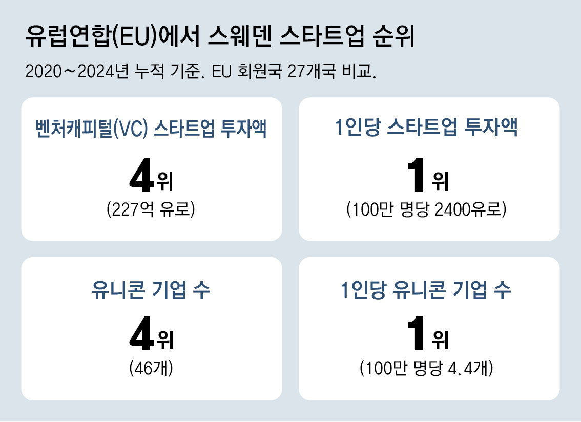 스웨덴의 스타트업 생태계 핵심은 민간 주도 혁신이다. 경제협력개발기구(OECD)에 따르면 2024년 기준 스웨덴 국내총생산(GDP) 대비 VC 투자 비율은 0.11%로 추정된다. 유럽연합(EU) 회원국 평균(0.05%)보다 두 배 이상으로 높다. 1인당 VC 투자액은 2020∼2024년 누적액 기준 EU 회원국 중 1위다. 인구 100만 명당 2400유로로 추정된다.