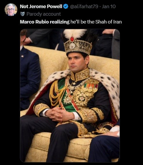 소셜미디어 엑스(X)에 확산된 루비오 밈 중 하나로, 이란 정권 종식 후 왕(샤)에 오를 것이란 풍자다. (소셜미디어 엑스 @alifarhat79)/뉴스1