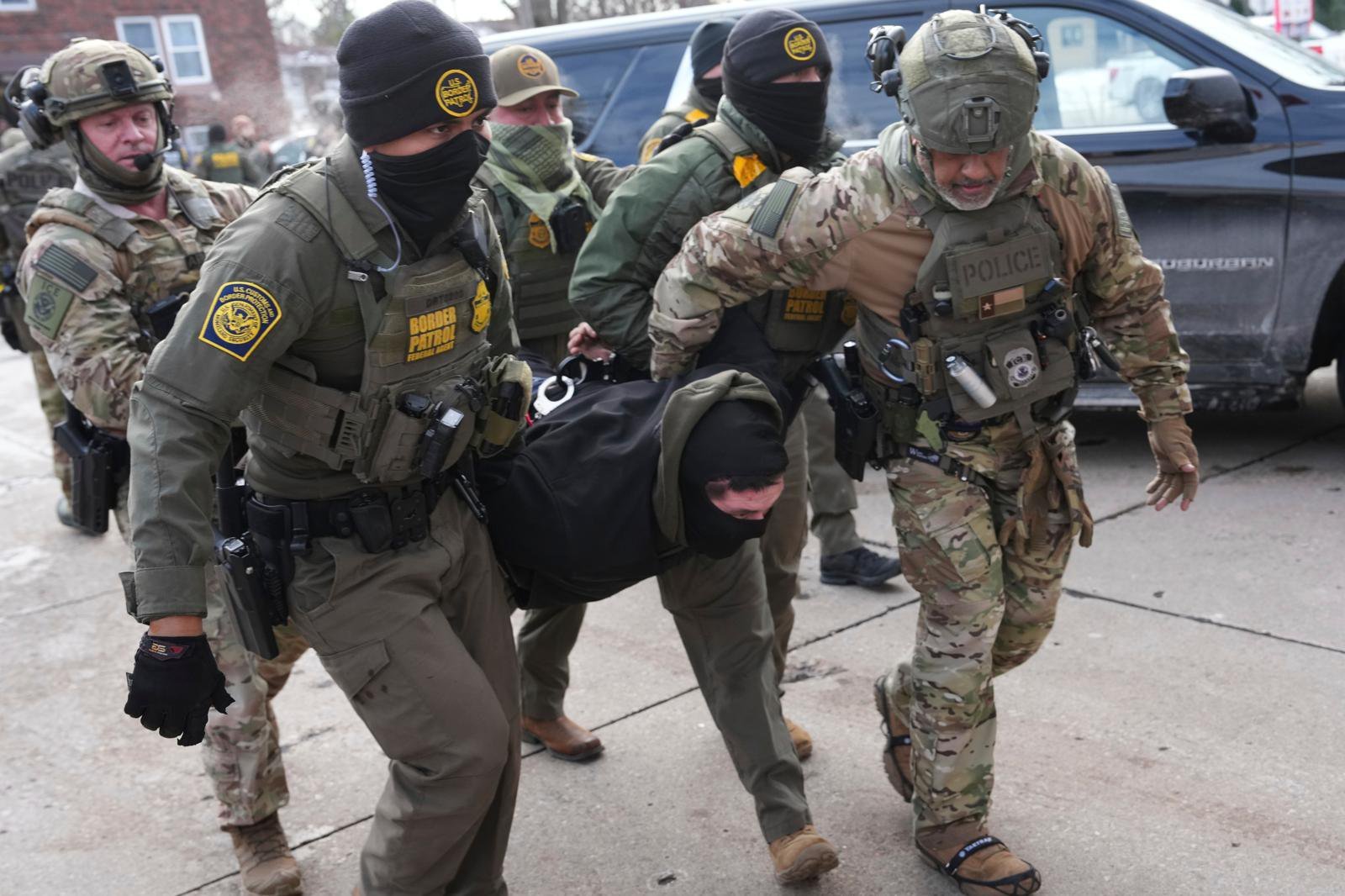 11일(현지 시간) 미 미네소타주 세인트폴에서 경찰과 국경수비대 요원들이 한 남성을 체포해 연행하고 있다. 2026.01.12 세인트폴=AP 뉴시스