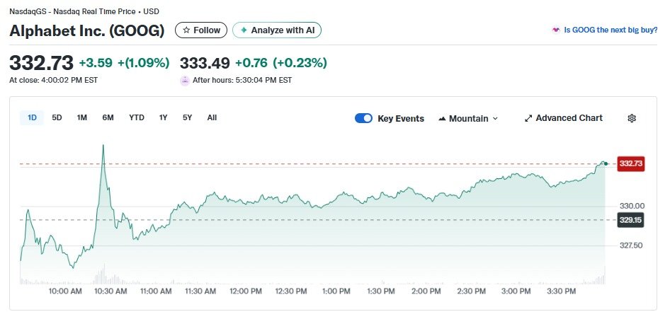 12일(현지 시각) 뉴욕증시에서 알파벳은 1.09% 상승한 332.73달러를 기록했다.