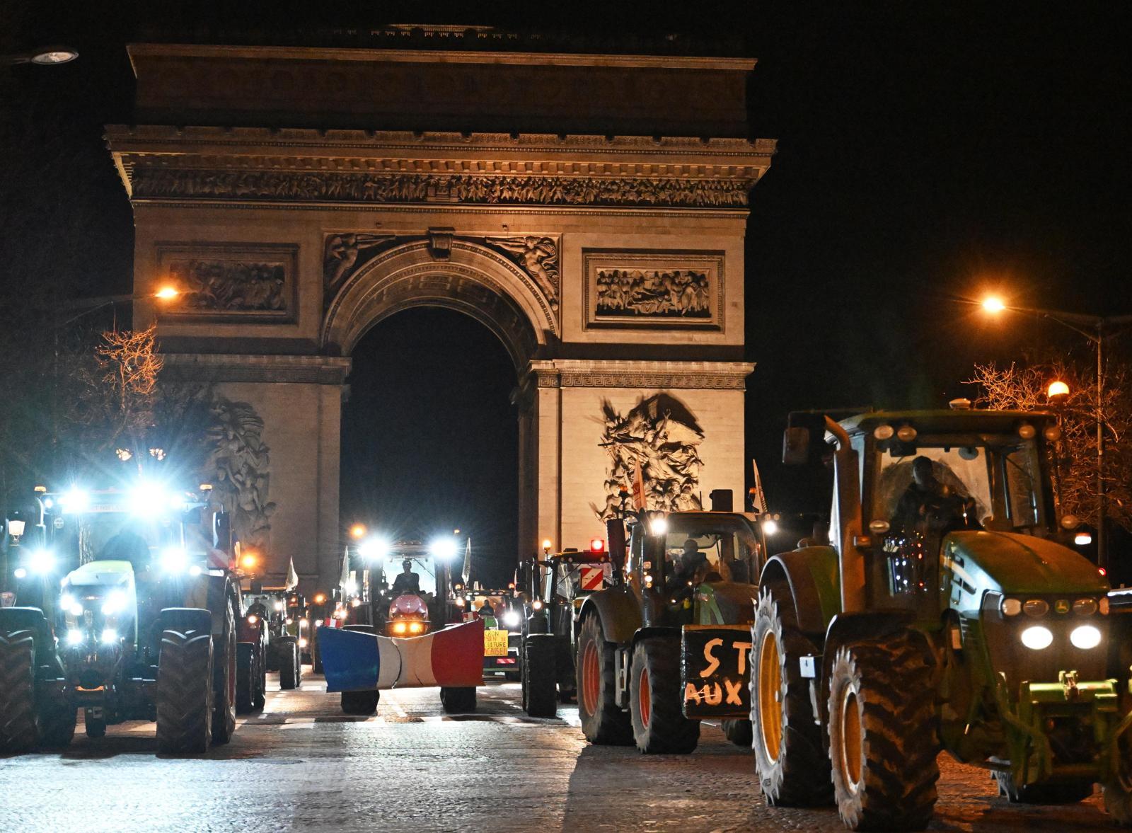 13일 프랑스 파리에서 농민들이 트랙터를 몰고 개선문을 통과한 뒤 샹젤리제 거리를 행진하고 있다. 이날 프랑스 전역에서 모인 농민들은 17일 체결될 예정인 유럽연합(EU)과 남미공동시장(메르코수르·MERCOSUR) 간 자유무역협정(FTA)에 반대하며 항의 시위를 벌였다. 프랑스는 이탈리아, 스페인과 더불어 유럽의 대표적 농업강국으로 꼽힌다.