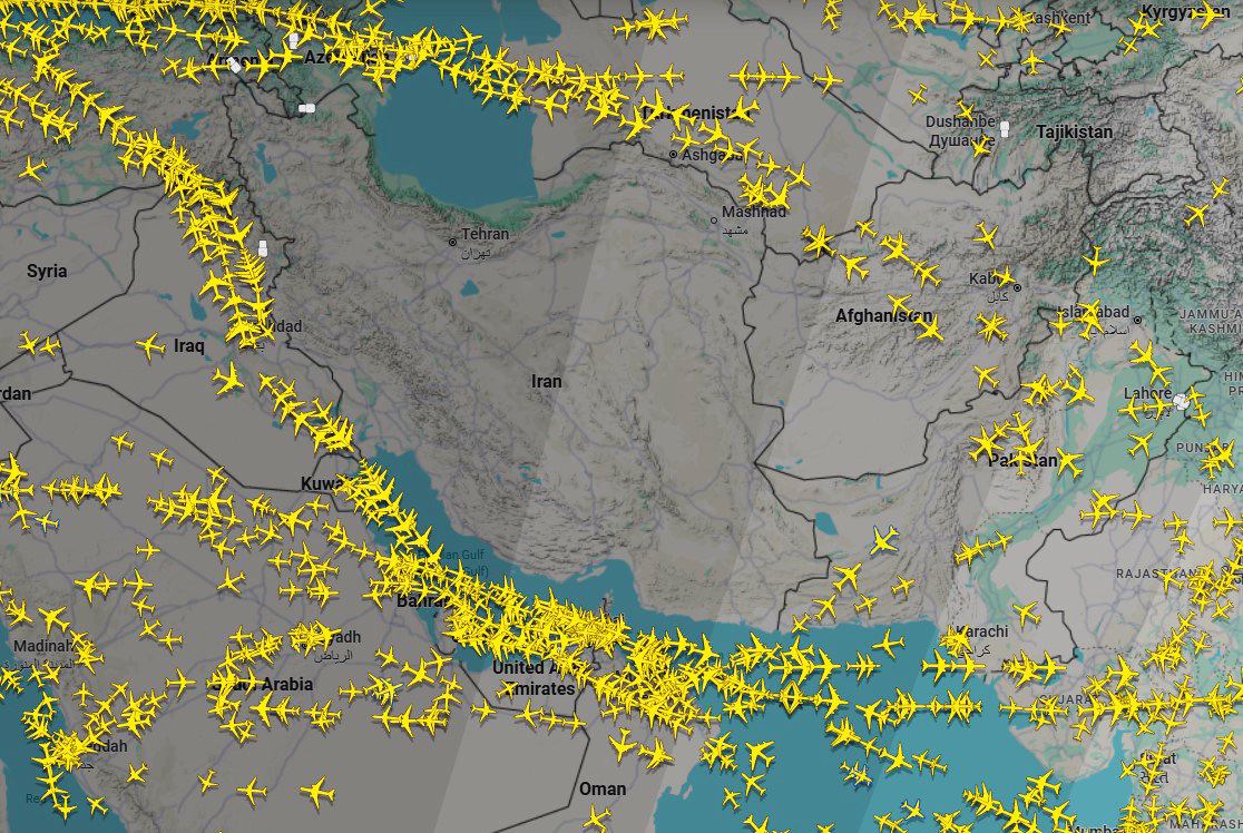 flightradar24는 전세계의 항공가 이동하는 정보를 실시간으로 표시해준다. 이 사이트에 들어가보면 현재(한국시간 15일 11시 기준) 이란 상공을 지나는 항공기는 단 한대도 없다. 모두 우회해 가느라 인근 국가 상공에 몰려 있는 모습이다.
