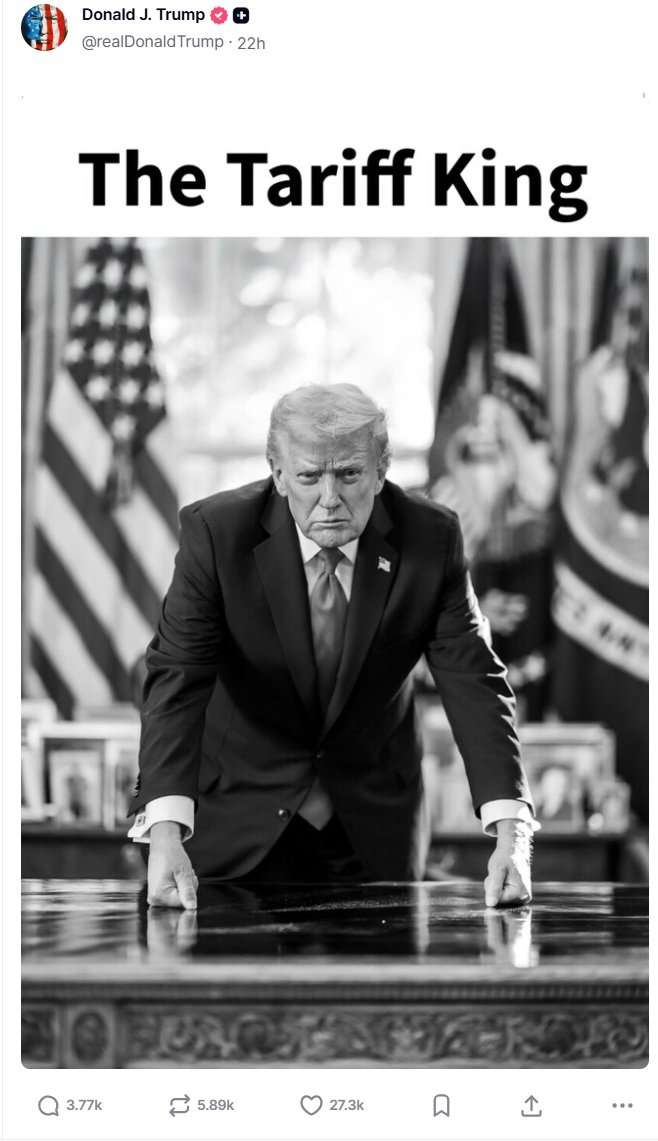 트럼프 대통령은 별도로 같은 사진을 올렸는데, 이번에는 사진 윗부분에 ‘관세 왕’이라는 문구가 적혔다.