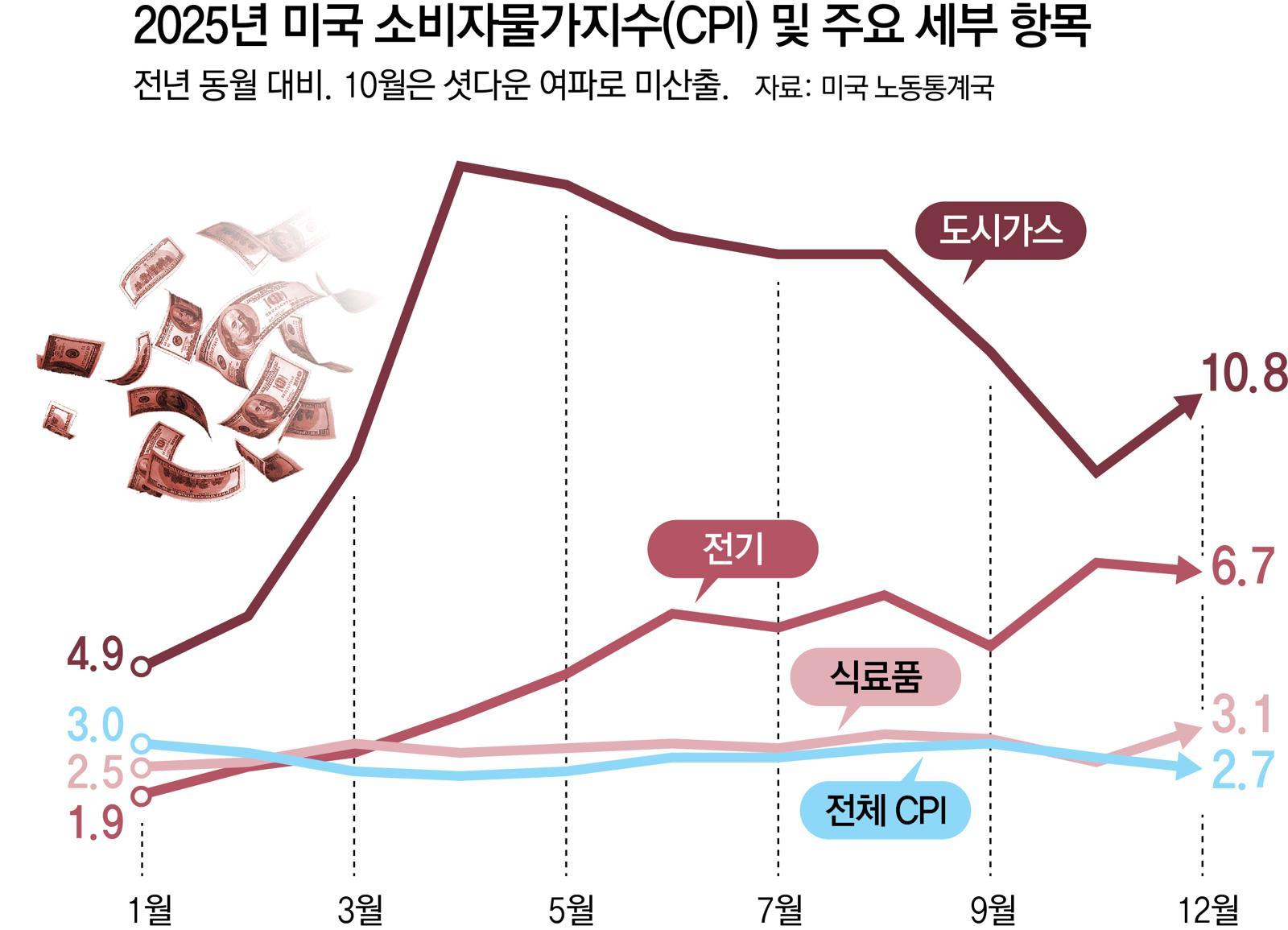 미국 노동통계국에 따르면 미국의 소비자물가지수(CPI)는 2025년 한 해 동안 전년 대비 2.7% 상승했다. 그러나 세부 항목 중 식료품(2.88%), 전기료(4.68%), 도시가스비(11.34%)의 연간 상승률은 전체 CPI보다 크게 높았다.