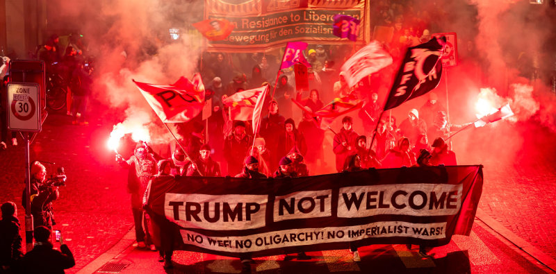 “트럼프 방문 반대” 19일(현지 시간) 스위스 취리히 시민들이 인근 다보스에서 이날부터 23일까지 열리는 세계경제포럼(WEF·다보스포럼)에 도널드 트럼프 미국 대통령이 21일 참석하는 것을 반대하는 시위를 벌이고 있다. ‘트럼프를 환영하지 않는다(Trump Not Welcome)’는 펼침막과 횃불이 보인다. 트럼프 대통령이 덴마크령 그린란드에 대한 병합 의지를 강조하고 그린란드에 파병한 유럽 8개국을 상대로 추가 관세 부과까지 발표하자 유럽에서 전방위적인 반(反)트럼프 여론이 일고 있다. 취리히=AP 뉴시스