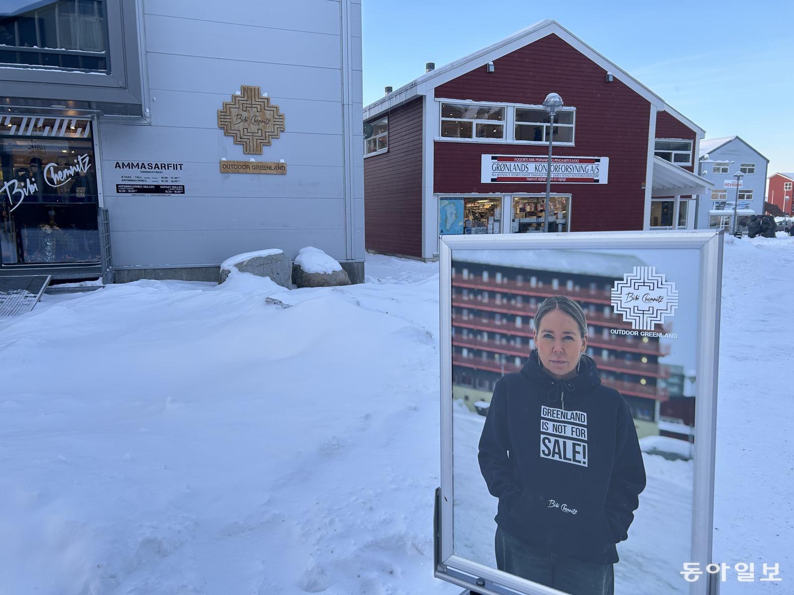 20일(현지 시간) 덴마크령 그린란드 누크 중심부에 ‘그린란드는 매매의 대상이 아니다’는 문구가 여기 저기 붙어있다. 그린란드의 한 아웃도어 브랜드는 이 문구가 적힌 티셔츠를 절찬리에 판매하고 있는데, 매진 행렬을 기록하고 있다. 누크=유근형 특파원많은 그린란드 사람들은 최근 ‘그린란드는 매매의 대상이 아니다’라고 외친다. 현지의 한 아웃도어 브랜드는 이 문구가 적힌 후드티를 최근 내놓았는데, 엄청난 인기를 누리고 있다. 또 해외에서도 큰 주목을 받고 있다.