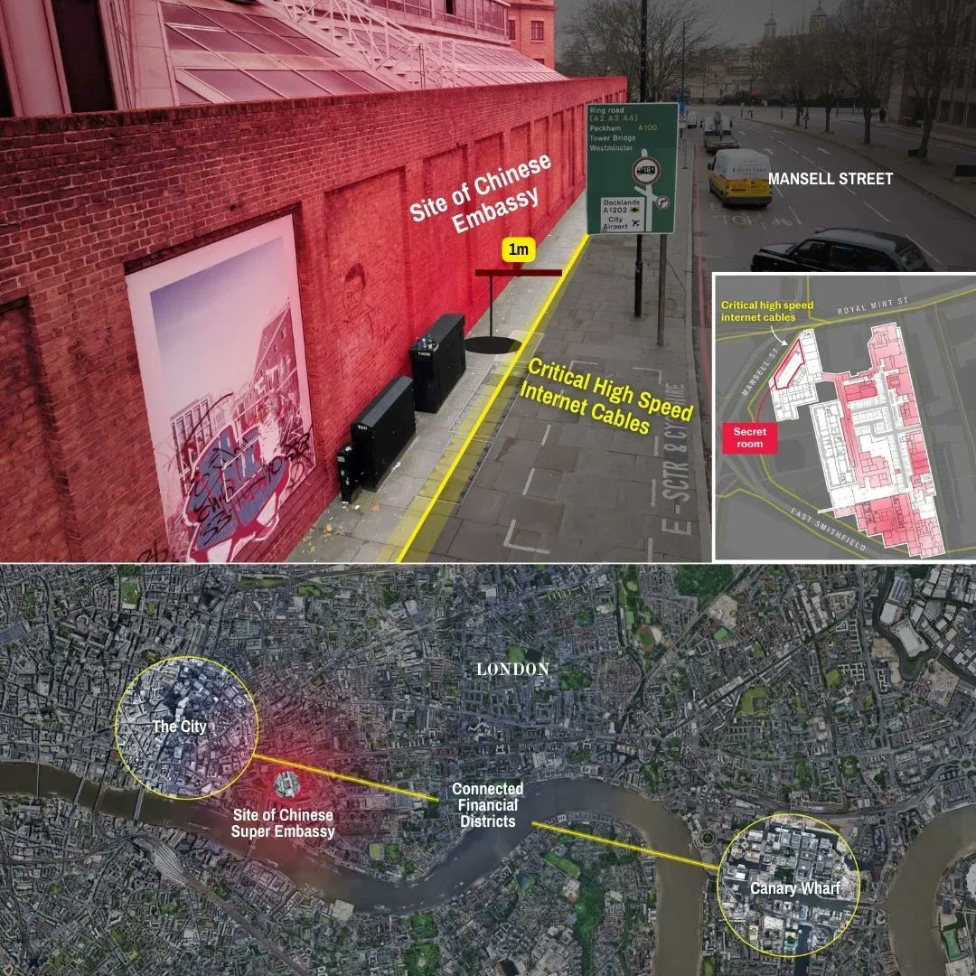 실제 새 대사관은 런던의 금융 밀집지 ‘시티오브런던’과 인접해 있다. 지하로는 민감한 통신용 광섬유 케이블 또한 지난다. 12일 영국 일간 텔레그래프가 입수한 대사관 설계도에 따르면 건물 지하에는 208개의 방이 조성될 것으로 보인다. 지하 시설의 용처를 두고 중국의 첩보 활동, 반체제 인사를 가둘 불법 구금 시설 등으로 이용될 것이라는 우려가 끊이지 않는다.