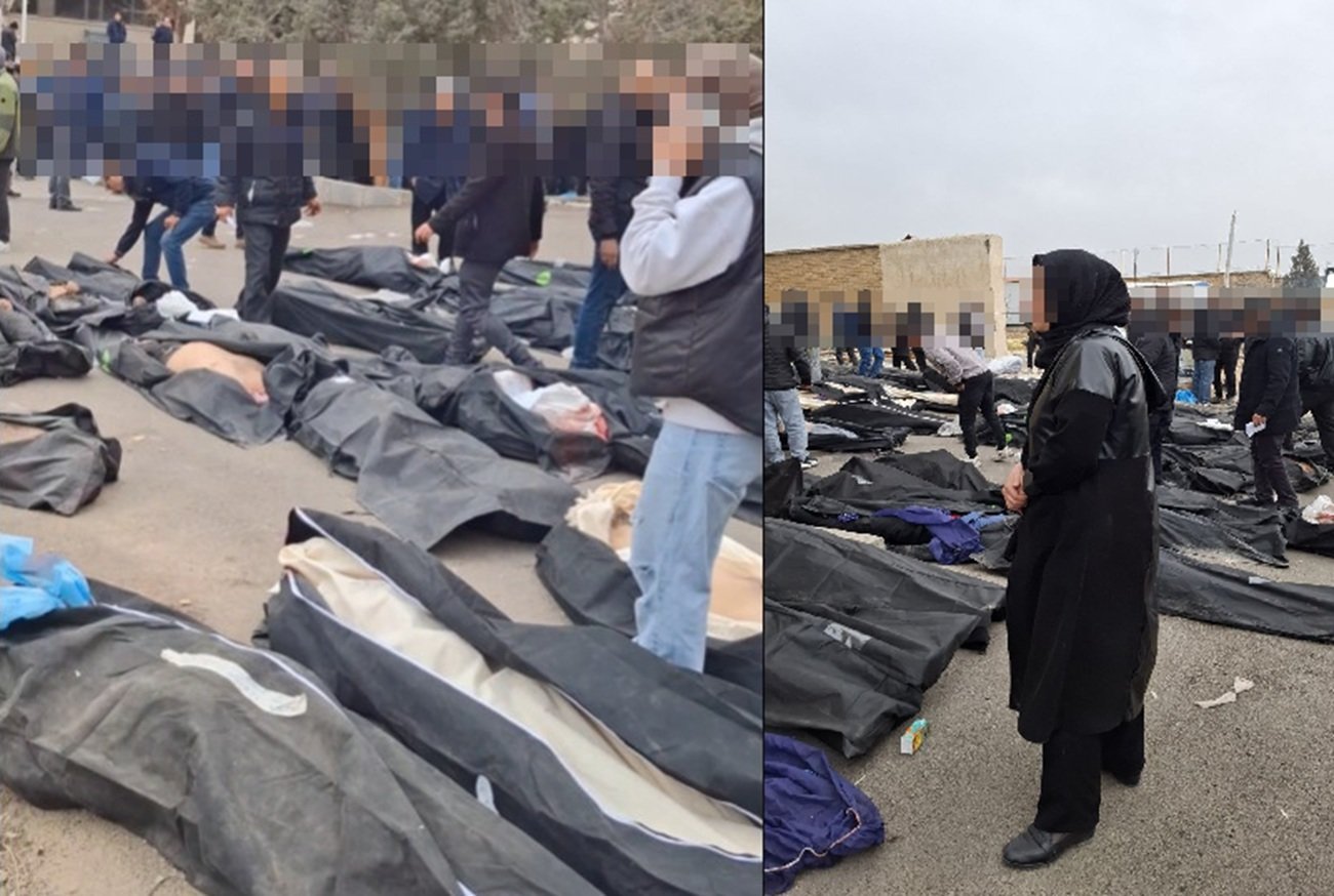 1월 10일 이란 테헤란 인근 카흐리자크 법의학센터 앞에 시위 사망자들의 시신이 안치된 모습. X @Vahid 캡처