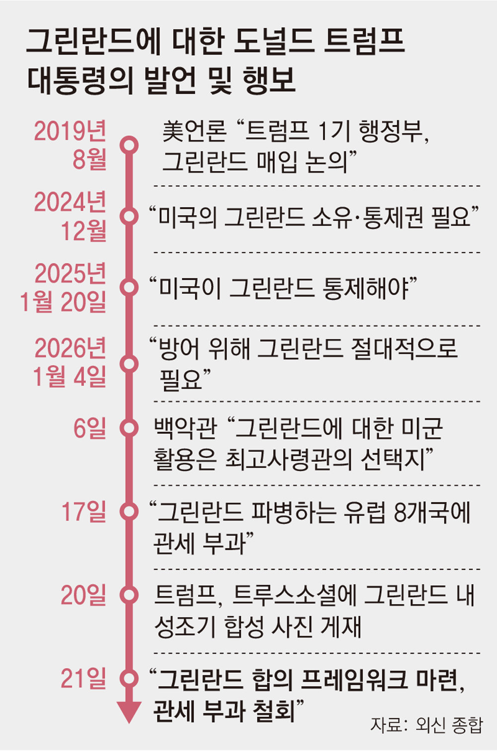 최근 도널드 트럼프 미국 대통령의 덴마크령 그린란드 병합 추진 발언으로 촉발된 미국과 유럽 주요국 간의 갈등과 군사적 긴장감 고조 상황은 일단 사그라드는 모양새다. 트럼프 대통령이 21일(현지 시간) 마르크 뤼터 북대서양조약기구(NATO·나토) 사무총장과 회담 뒤 그린란드에 관한 ‘프레임워크’(합의 틀) 마련, 그린란드 파병 유럽 8개국(덴마크 영국 프랑스 독일 핀란드 스웨덴 노르웨이 네덜란드)에 대한 보복 관세 철회를 밝혔기 때문이다.