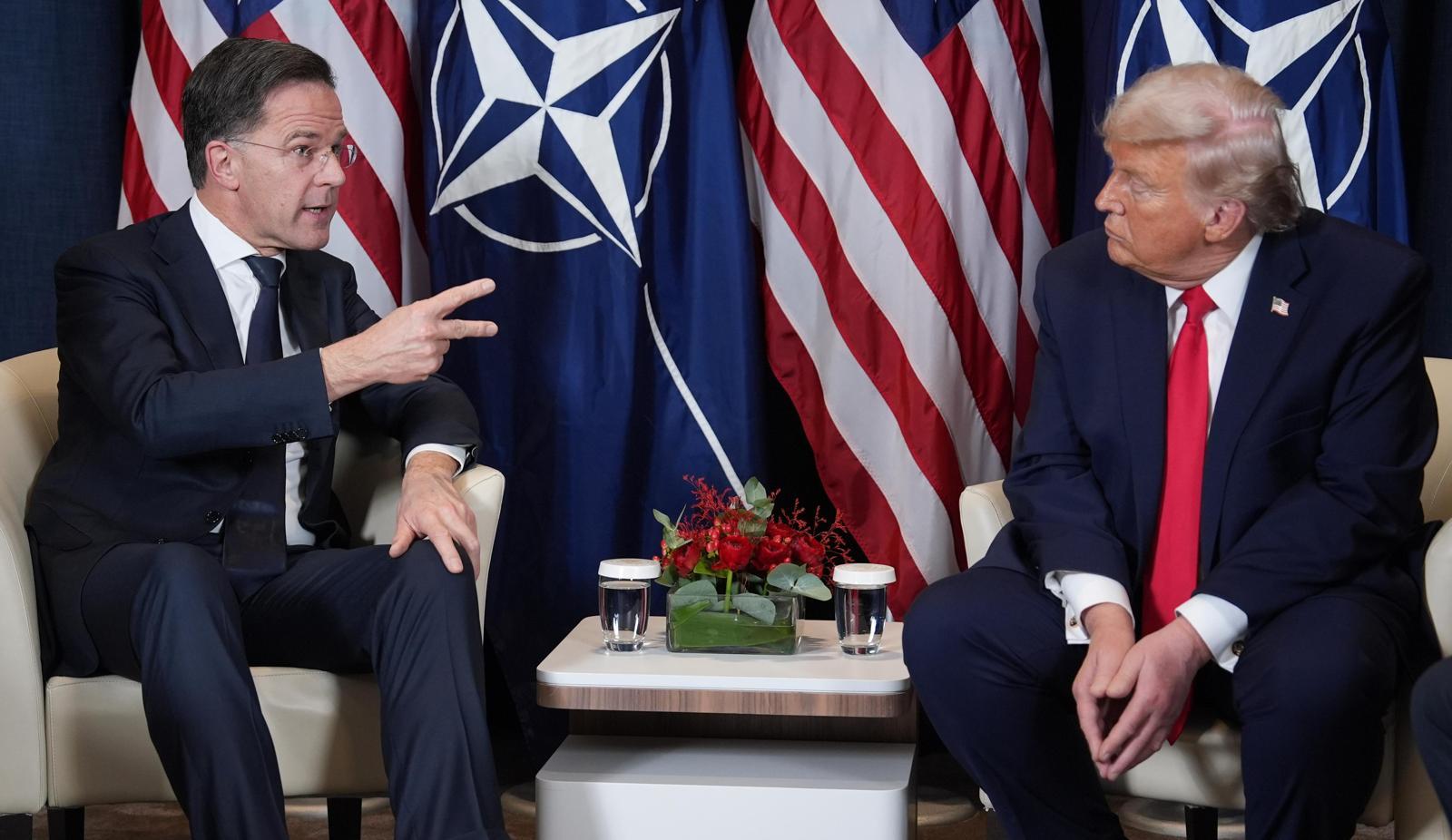 도널드 트럼프 미국 대통령(오른쪽)이 21일 스위스 다보스에서 열린 세계경제포럼(WEF) 연차총회에서 마르크 뤼터 북대서양조약기구(NATO·나토) 사무총장과 회담하고 있다. 트럼프 대통령은 이후 “덴마크령 그린란드와 북극 지역에 관한 미래 합의의 ‘프레임워크’(협력 틀)를 마련했다”고 밝혔다. 자신의 그린란드 병합 시도에 반대했던 유럽 8개국에 예고했던 관세도 부과하지 않겠다고 밝혔다. 다보스=AP 뉴시스