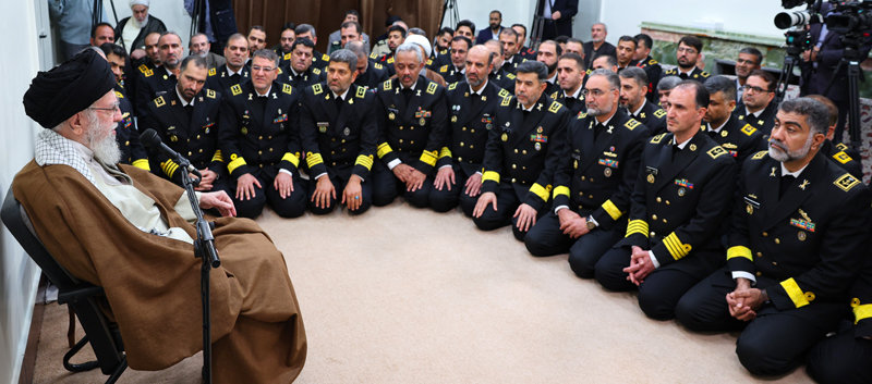 신정일치 국가 이란의 최고지도자 알리 하메네이(왼쪽)가 2024년 11월 수도 테헤란에서 군 회의를 주재하고 있다. 이란 혁명수비대 소속 해군 장교들이 무릎을 꿇은 채 하메네이의 발언을 경청하고 있다. 사진 출처 이란 최고지도자실 ‘X’