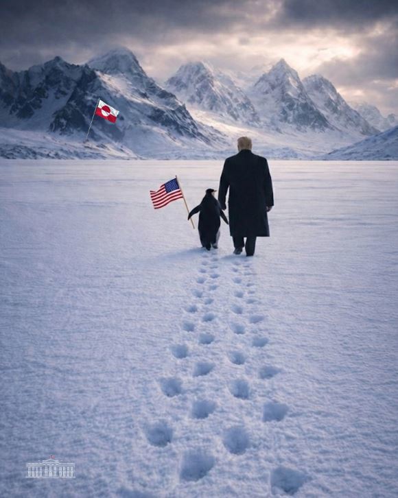 미국 백악관은 23일(현지 시간) 도널드 트럼프 대통령이 성조기를 든 펭귄과 함께 그린란드 설원을 걷는 합성 사진을 공식 소셜네크워크서비스(SNS)에 올렸다. 앞서 트럼프 대통령이 군사력 동원 등 무력 합병 카드는 집어넣었으나, 재차 그린란드를 향한 야욕을 드러낸 것이다.
