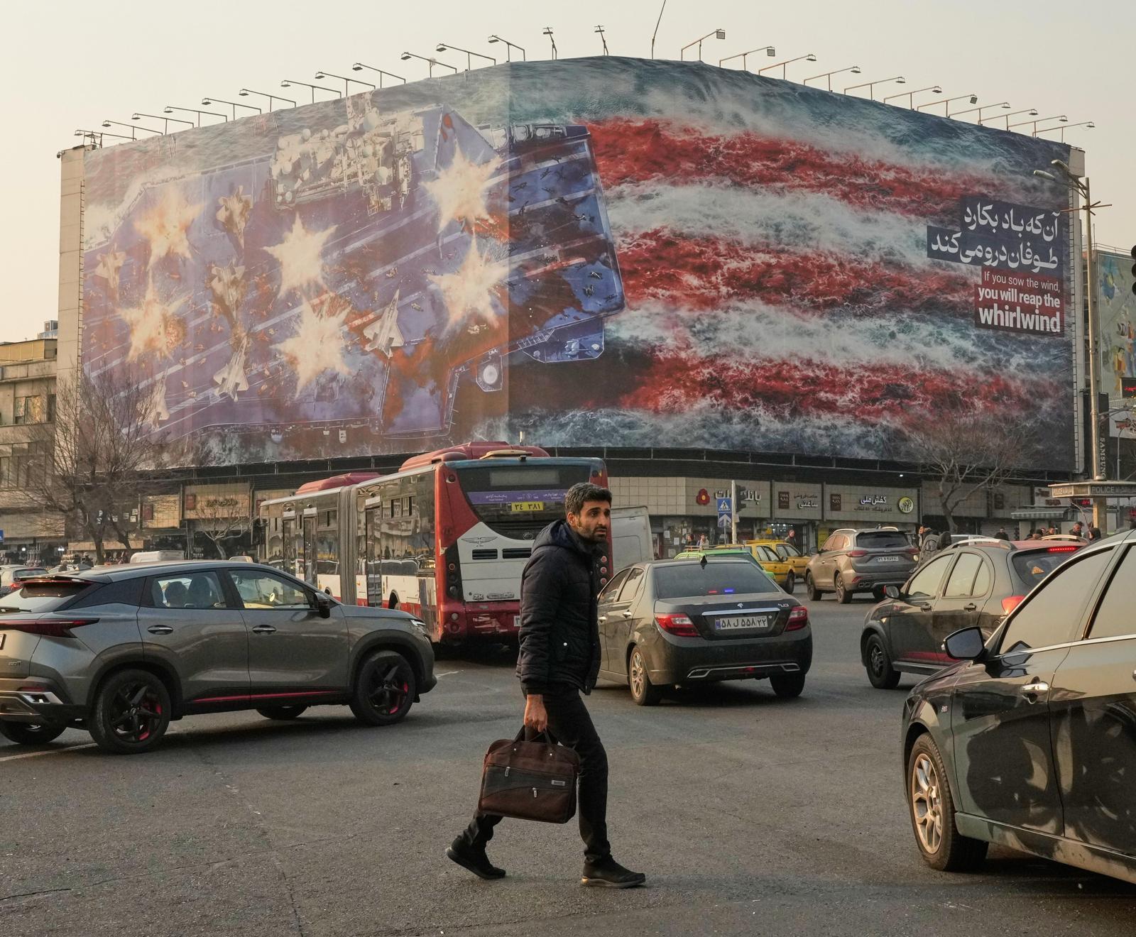 25일 AP통신은 이란 수도 테헤란의 도심 광장 대형 광고판에 미 항공모함이 공격받아 파괴된 그림이 걸렸다고 전했다. 푸른색 항공모함 갑판에서 붉은 피가 띠 모양으로 바다로 흘러내리는 장면인데, 전체적으로는 ‘피에 젖은 성조기’처럼 보인다. 그림 한쪽엔 ‘바람을 뿌리면 회오리를 거두게 될 것’이라는 경고 메시지도 적혀 있다. 미국의 군사 개입이 이뤄진다면 강력한 보복에 나서겠다는 의지를 반영한 선전물로 해석된다. 해당 그림이 내걸린 엔켈라브 광장은 국가가 주관하는 집회 장소로 사용되는 장소다.