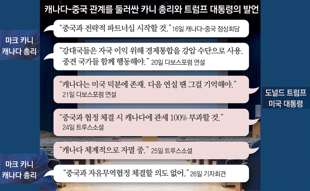 실제로 트럼프 대통령은 카니 총리 연설 다음 날 “캐나다는 미국 덕분에 존재한다”고 직격했다. 이에 카니 총리는 “캐나다는 미국 덕분에 존재하지 않는다”고 응수했다. 이어 24일 트럼프 대통령은 캐나다에 100% 관세를 매기겠다고 압박한 데 이어 25일 캐나다와 중국 간 일부품목 무역 합의를 두고 “역사상 최악의 합의 중 하나다. 캐나다가 체계적으로 자멸하고 있다”고 했다.