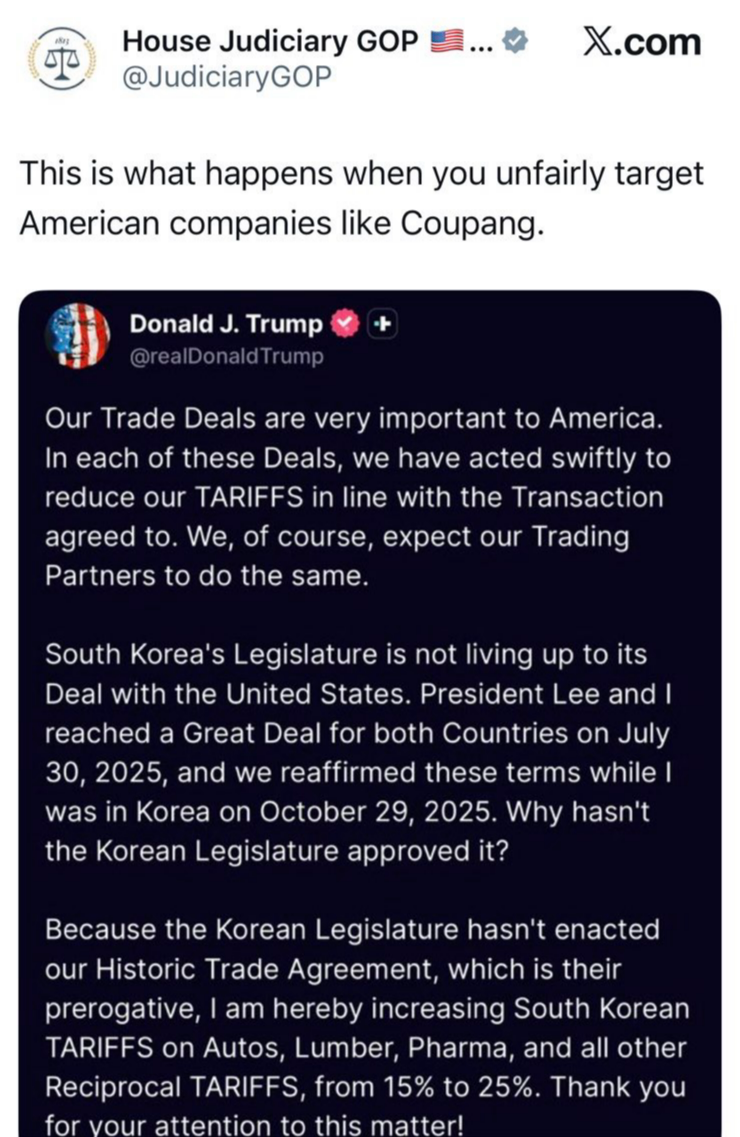 미국 하원 공화당 법사위원회는 이날 X 공식 계정에서 트럼프 대통령의 관련 발언을 두고 “쿠팡과 같은 미국 기업을 부당하게 표적으로(unfairly target) 삼으면 이런 일이 벌어진다”고 밝혔다. 트럼프 대통령의 발언에 대한 의도가 정확하게 알려지지 않은 가운데 미국의 집권당인 공화당이 쿠팡의 개인정보 유출 사태에 대한 한국 정부의 대응을 배경 중 하나로 내세운 것이다.
